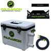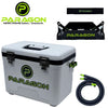The leakproof Viking Series cooler measures 16.5"L x 11"W x 13"H. The hinges and latches on the cooler lid can be reversed to allow for the most efficient routing of the hose outlets and easiest access for refilling. The internal 2 amp pump is designed to be wired directly to a 12 volt power supply. The side exit Guardian bulkhead connectors are Paragon’s emergency release option allowing an easy disconnect when a quick pull motion is applied to the connected hose set or garment.